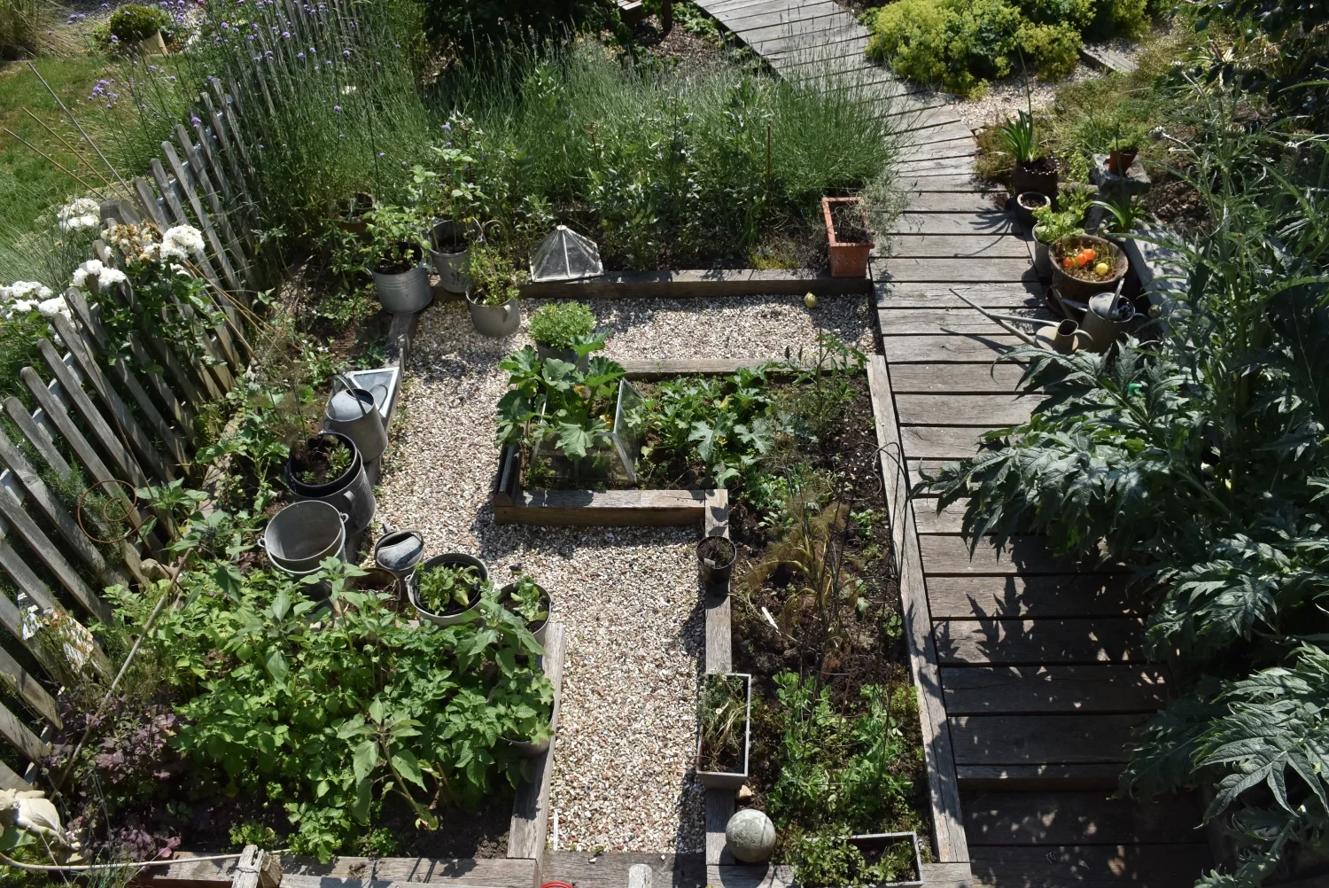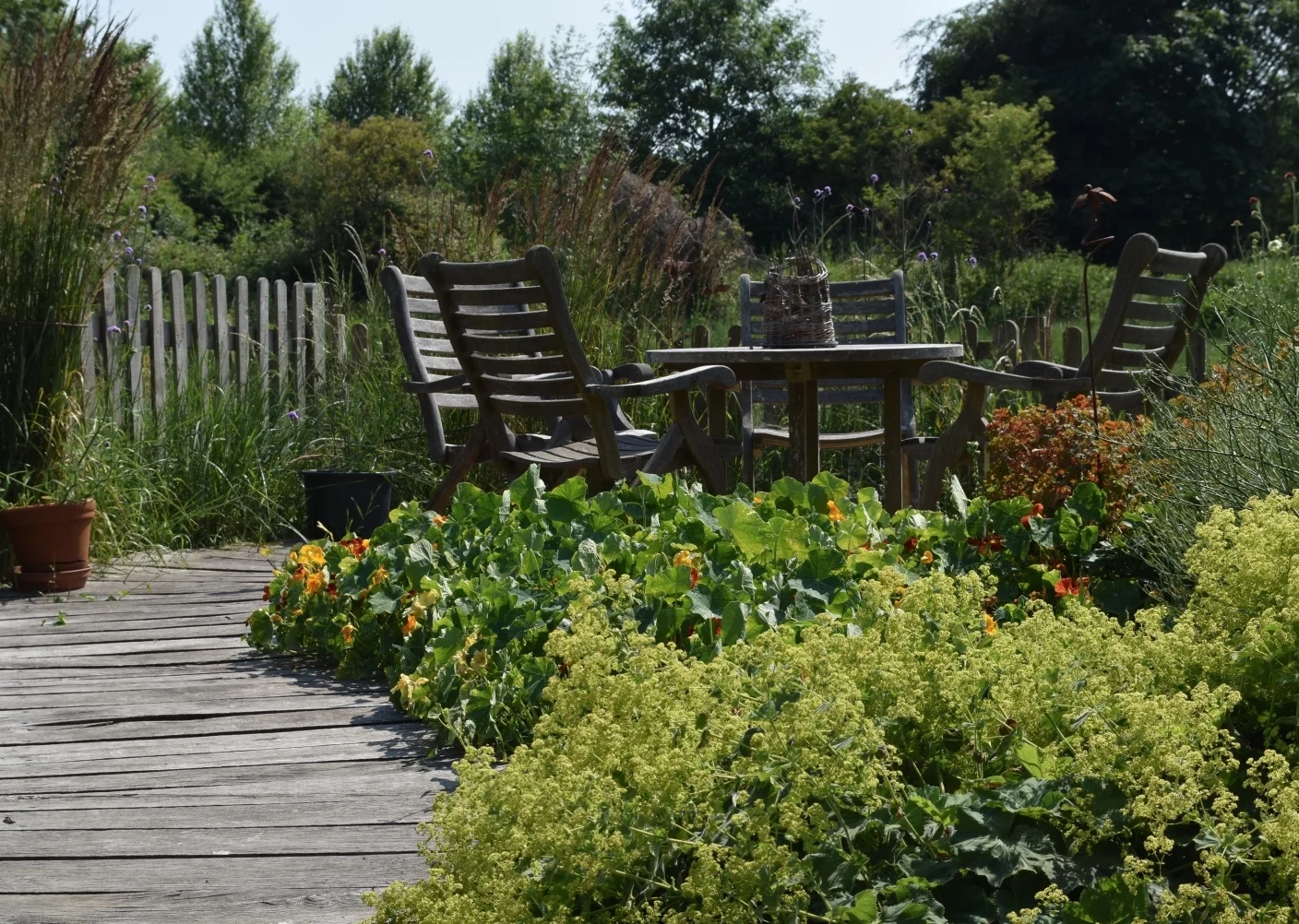 An Oak boardwalk runs through the site in a scooping curve leading to a circular seating area at the bottom of the garden. Several steps lead you up a slope to a bench seat which take in the views. Refreshingly the clients did not want a lawn. Large planting beds provide textural planting with a small area for some raised beds.